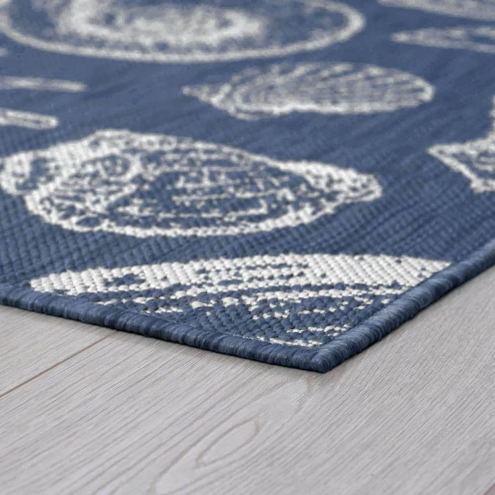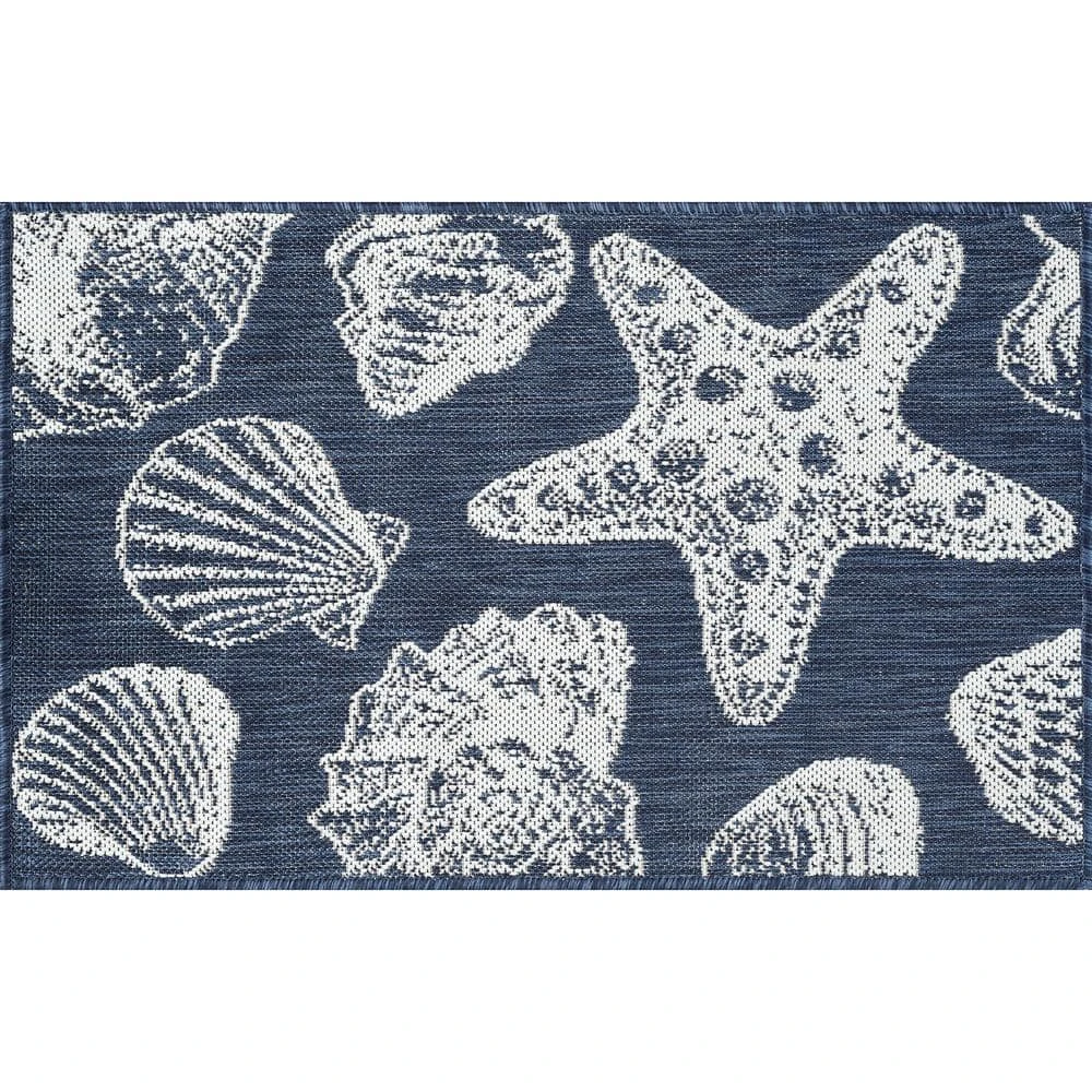 Unique shells and starfish pattern make a stunning indoor outdoor endurance area rug. Treated fibers resist staining and fading, this rug is built to perform. Perfect for a family room, sunroom, porch, deck, den, living room, playroom, nursery.