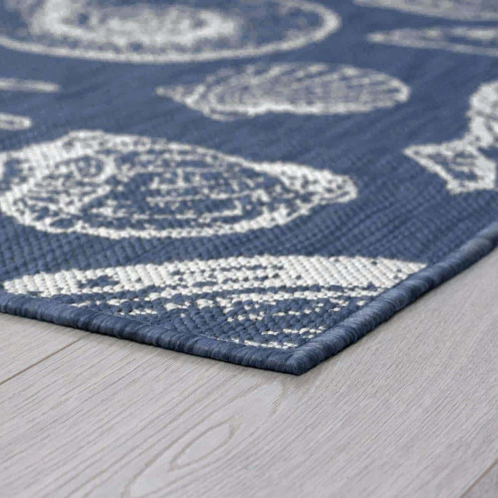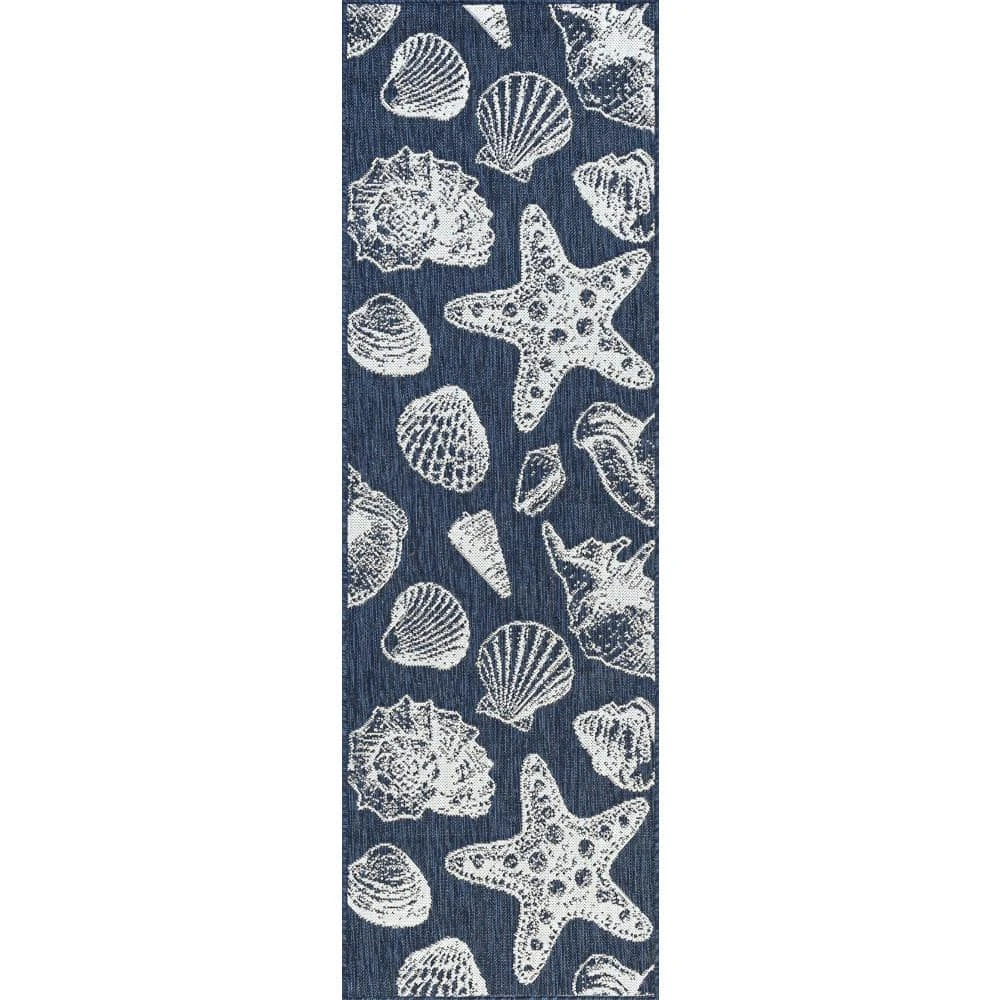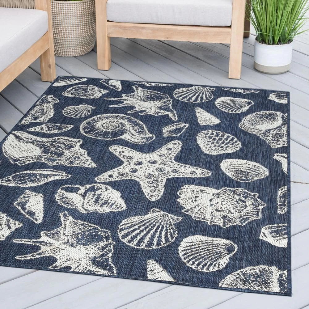 Unique shells and starfish pattern make a stunning indoor outdoor endurance area rug. Treated fibers resist staining and fading, this rug is built to perform. Perfect for a family room, sunroom, porch, deck, den, living room, playroom, nursery.