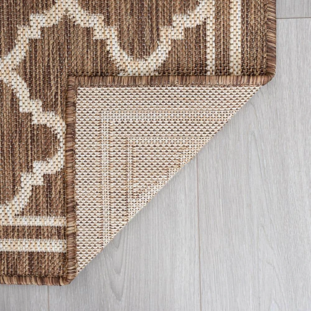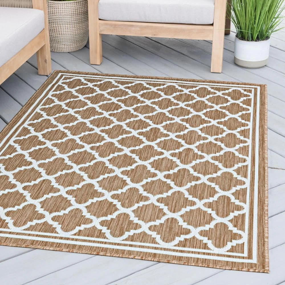 Escape to the Mediterranean with this cruise worthy indoor outdoor endurance area rug. The quatrefoil tile pattern is a true classic. Treated fibers resist staining and fading, this rug is built to perform.