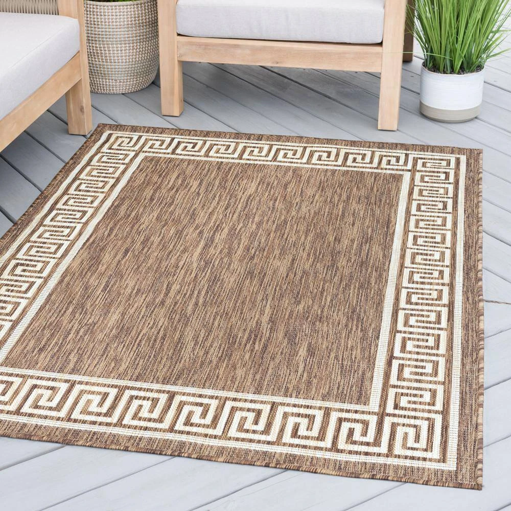 Enhance any setting with this Greek Key classic indoor outdoor endurance area rug. Solid center and intricate border give a Mediterranean feel in fresh color. Treated fibers resist staining and fading, this rug is built to perform.