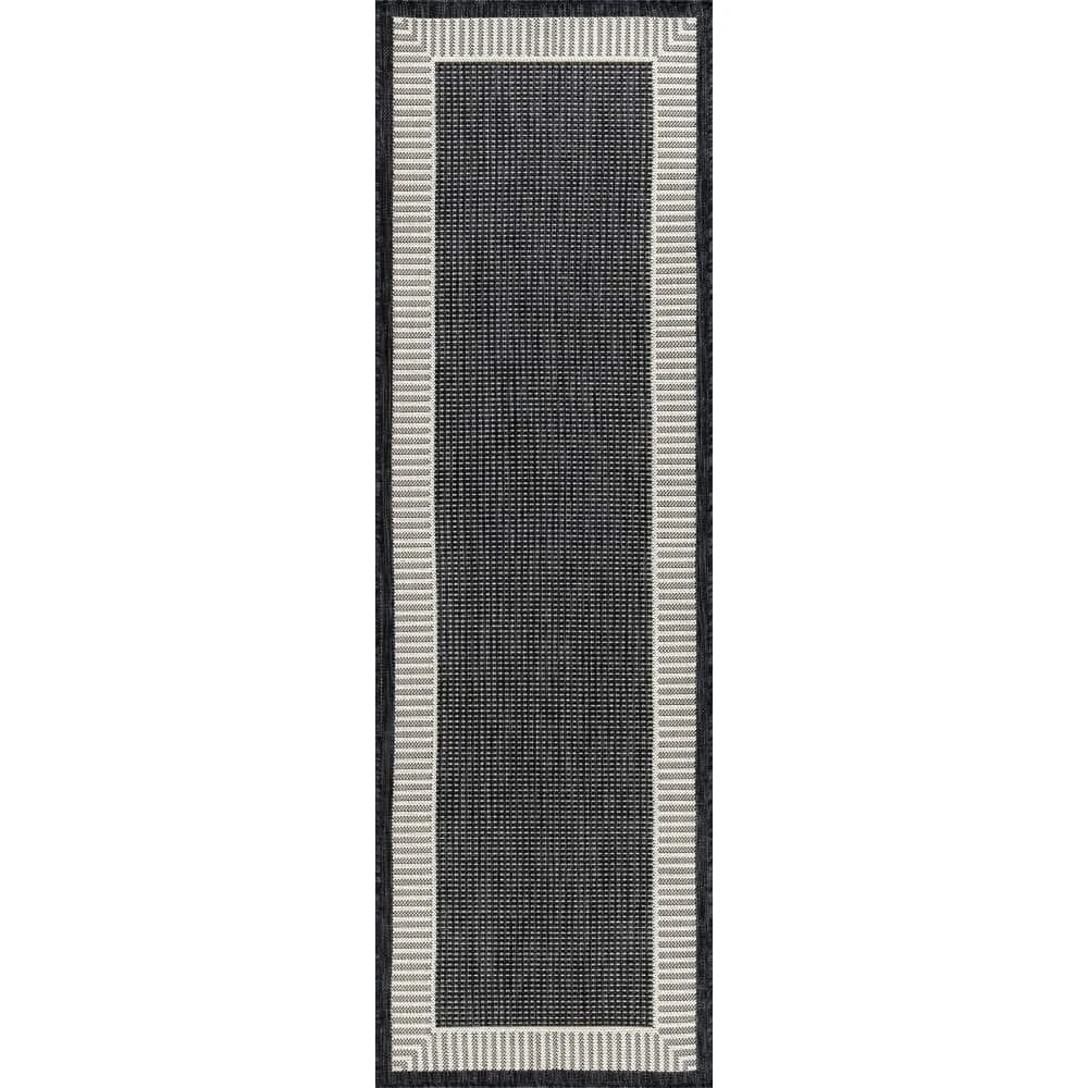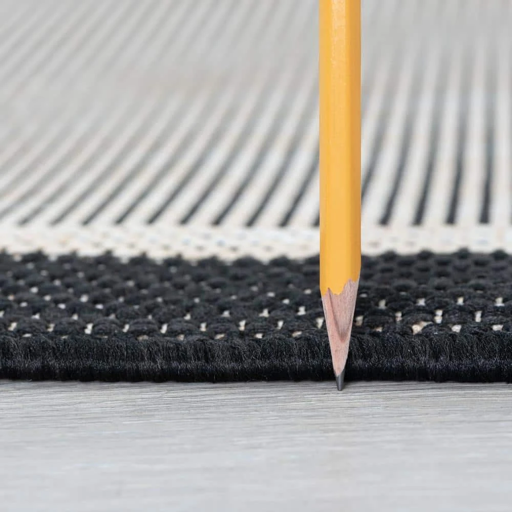 Create your private oasis with this solid indoor outdoor endurance area rug featuring a striped border. The simple styling is chic and elegant. Treated fibers resist staining and fading, this rug is built to perform.