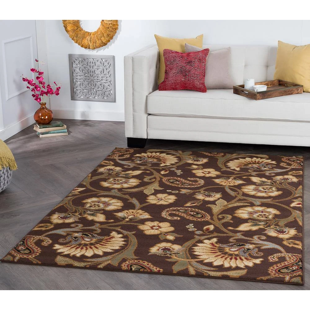 The Elegance Brown 7 ft. 6 in. x 9 ft. 10 in. Transitional Area Rug features a contemporary floral pattern. Soft earth tones allow the piece to be beautiful yet not overwhelming. A perfect piece to convey a sharp sense of natural beauty.
