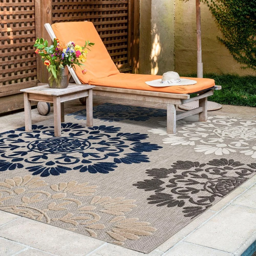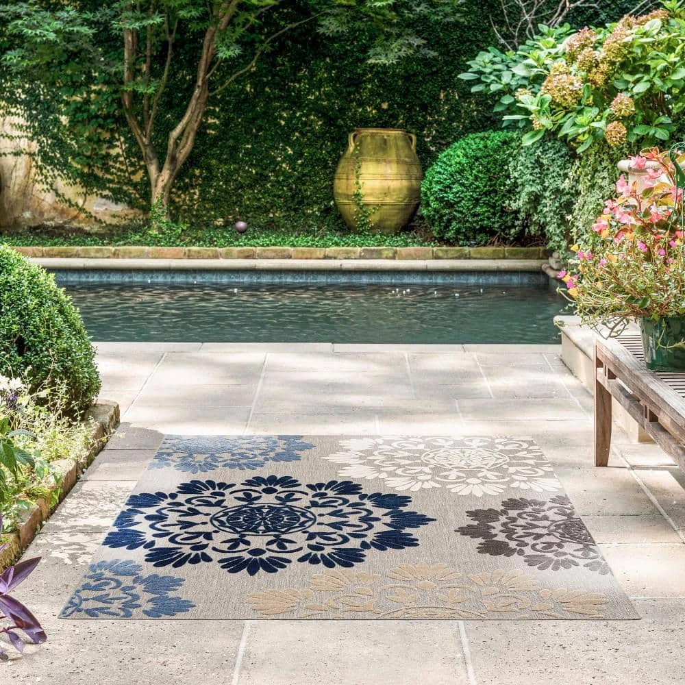 The high-low pile combined with easy-care endurance of this colorful waterproof outdoor rug creates a relaxing space for your indoor or outdoor area. The modern floral Suzani in a geometric pattern has a dynamic appeal. Vacuum or shake to remove debris. Spot clean or clean outside with water; spray with garden hose to rinse. Allow to dry thoroughly.