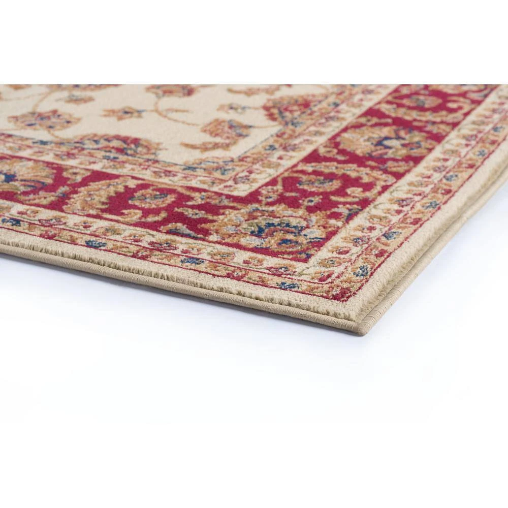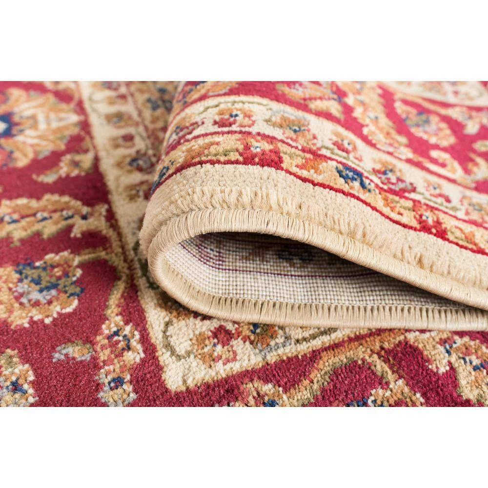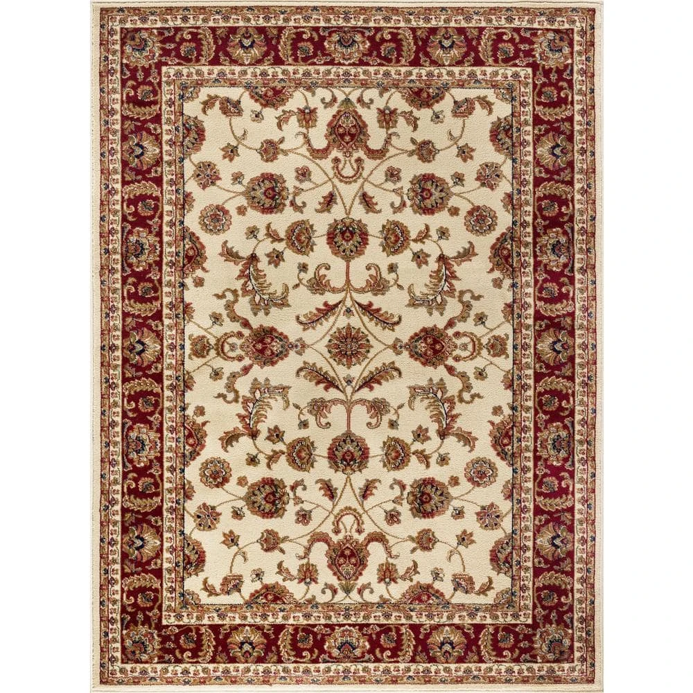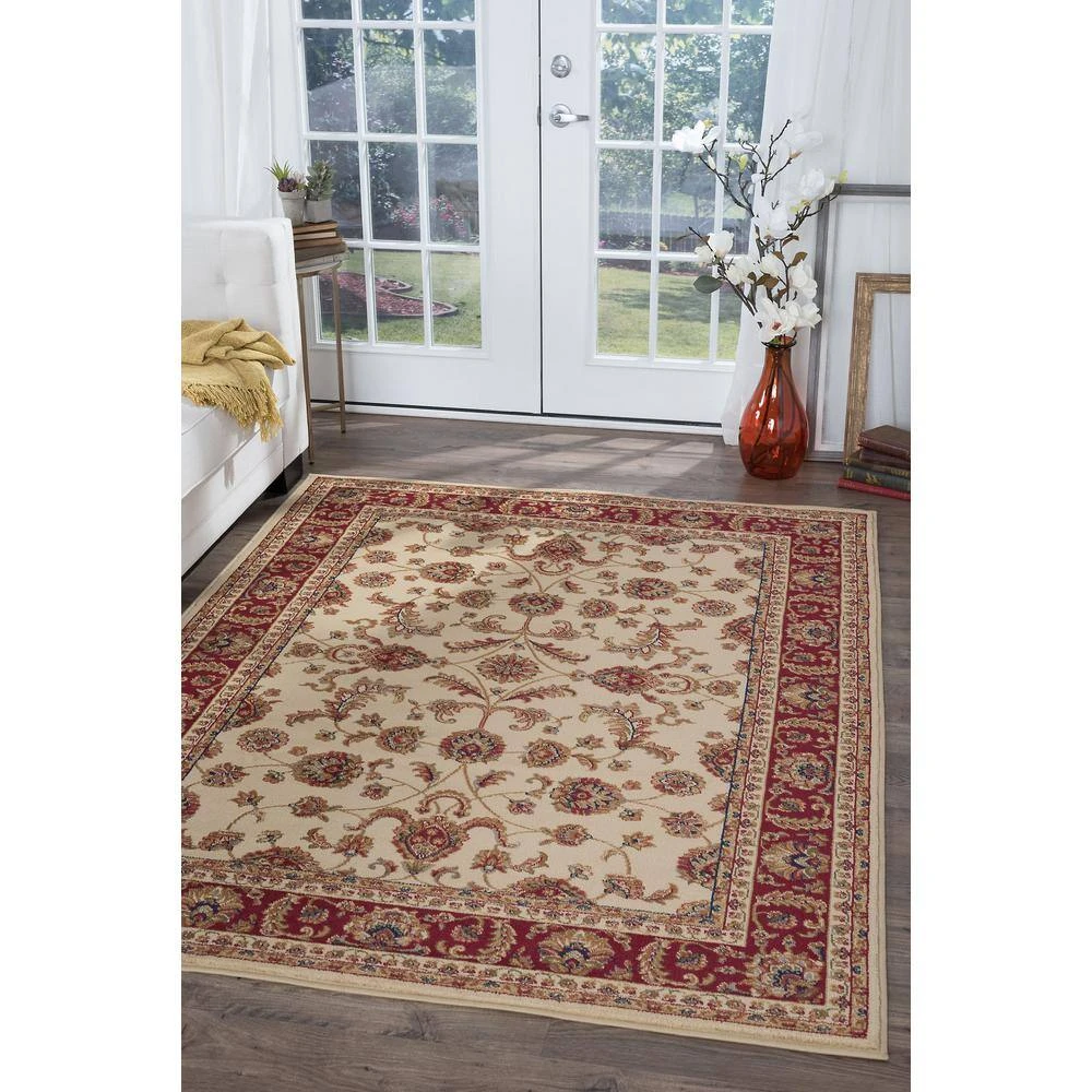 Experience timeless tradition and lasting quality with this area rug. This rug has a traditional oriental pattern created in beige on deep red. The ornate design is highlighted with black and green and features a floral border.