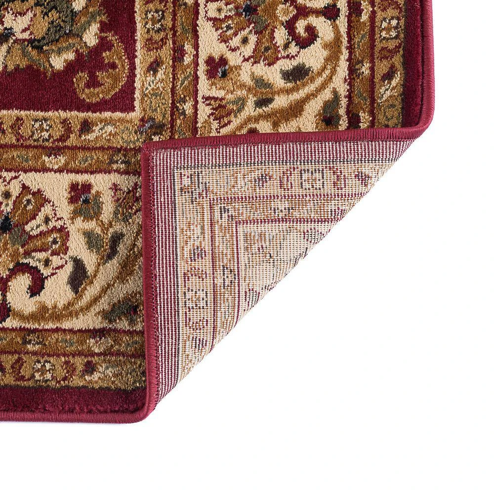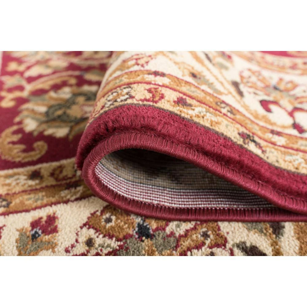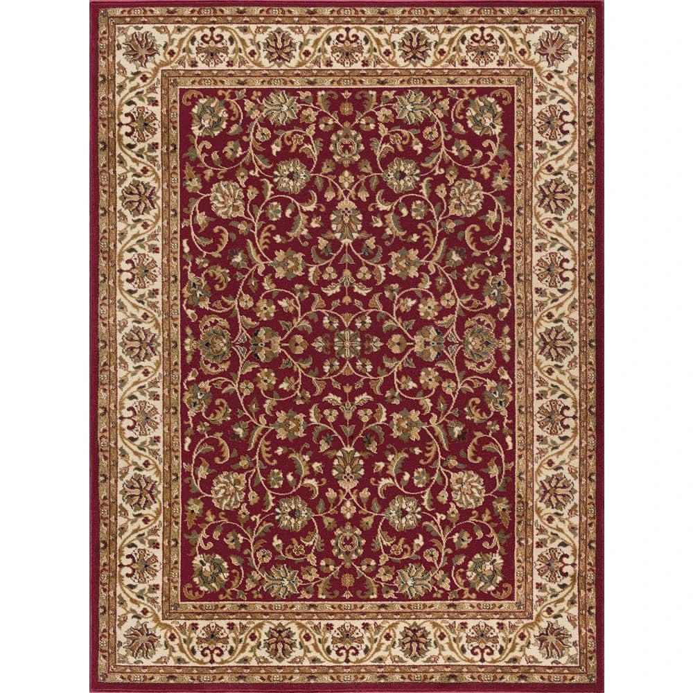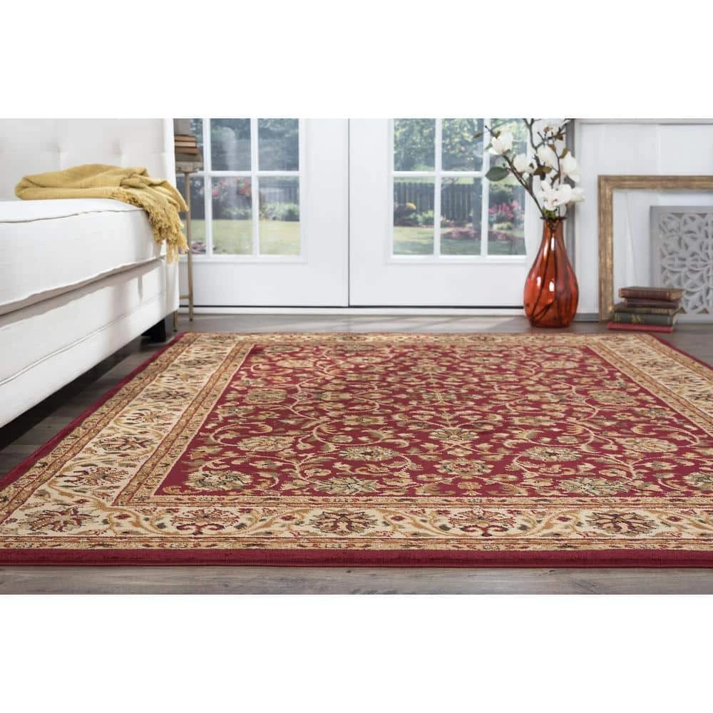 Experience timeless tradition and lasting quality with this area rug. This rug has a traditional oriental pattern created in beige on deep red. The ornate design is highlighted with black and green and features a floral border.